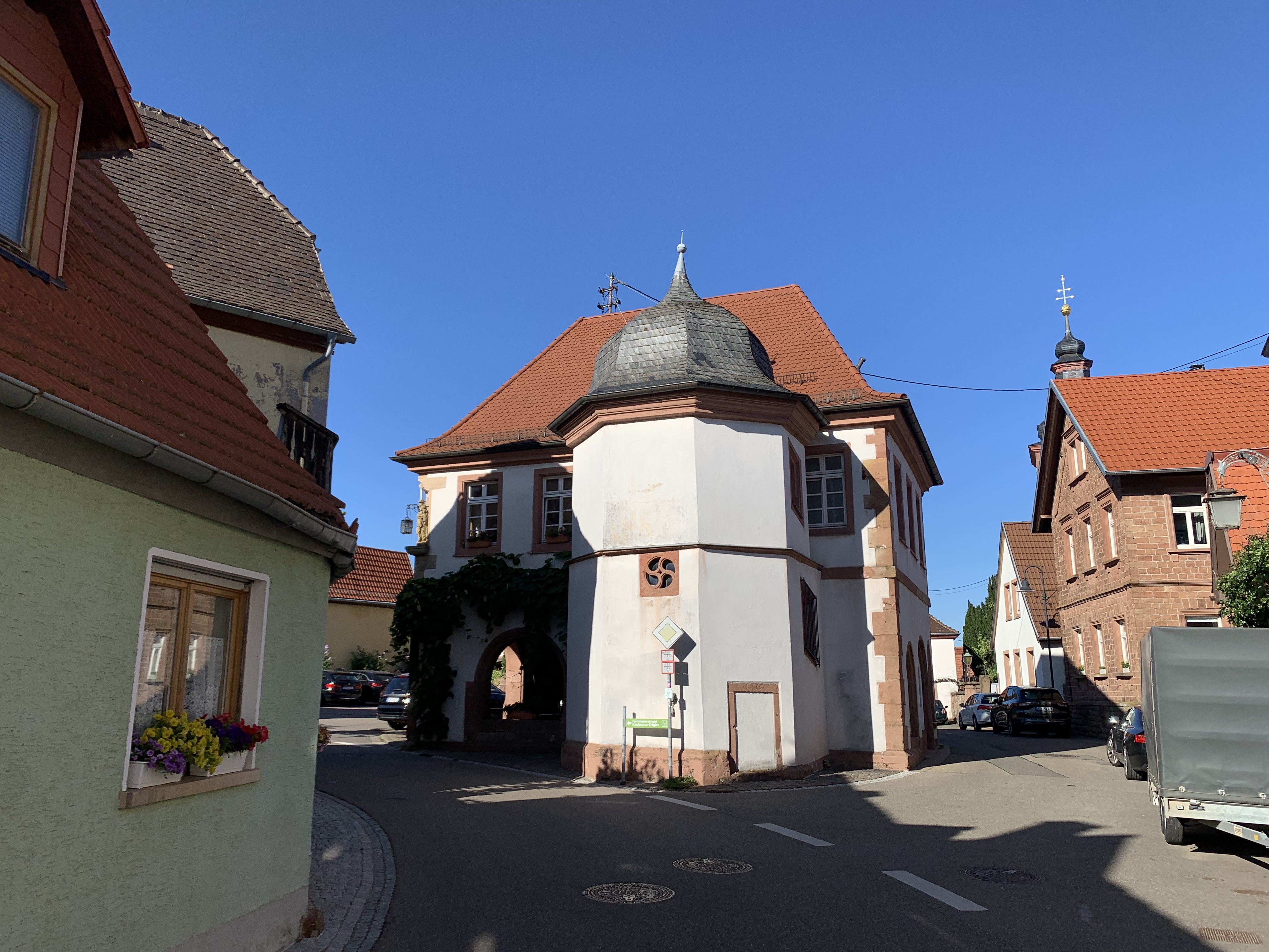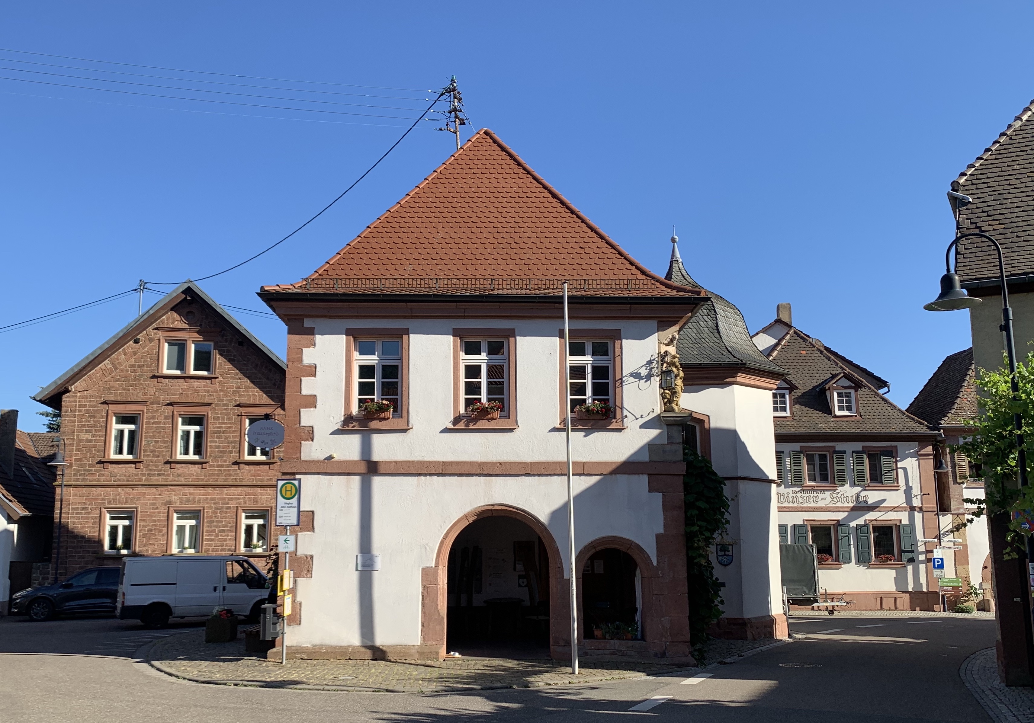 Das ehemalige Rathaus wurde im 16. Jahrhundert mit einer Arkadenhalle erbaut und im 18. Jahrhundert barock überformt. 1608 wurde ein polygonaler Treppenturm mit einer schneckenförmigen Sandsteintreppe ergänzt. An der Ostfassade wurde im Jahr 1999 vom Fremdenverkehrsverein der Kattelbas-Brunnen errichtet, der an die Hebamme Katharina Lutz (genannt Kattelbas) erinnert und damit der einzige Hebammenbrunnen Deutschlands ist. Es beherbergt heute einen kleinen Dorfladen mit Café.