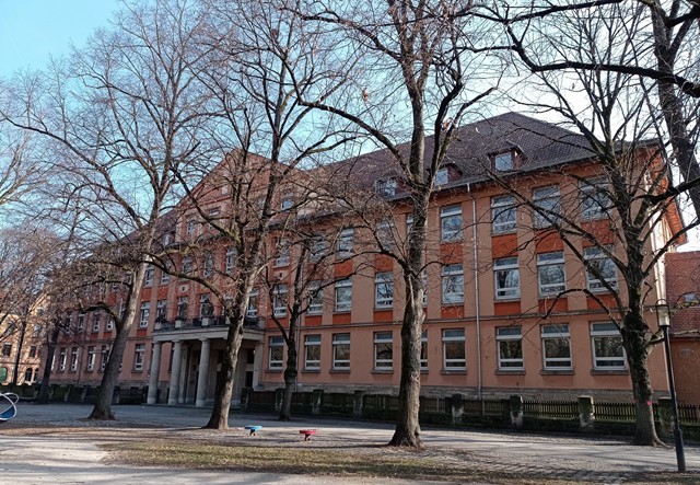 1910-12 nach Plänen des Stadtbaumeisters G. Blümer als Mittelschule für Mädchen erbaut. Von Anfang an städtebauliche Funktion durch querriegelartige Lage am östlichen Ende der 1907 entstandenen Schilleranlage. Ausgestaltung in klassizistischer Formensprache mit rustizierter Sockelzone, umlaufendem Gurtgesims sowie auf drischen Säulen ruhendem Portikus.