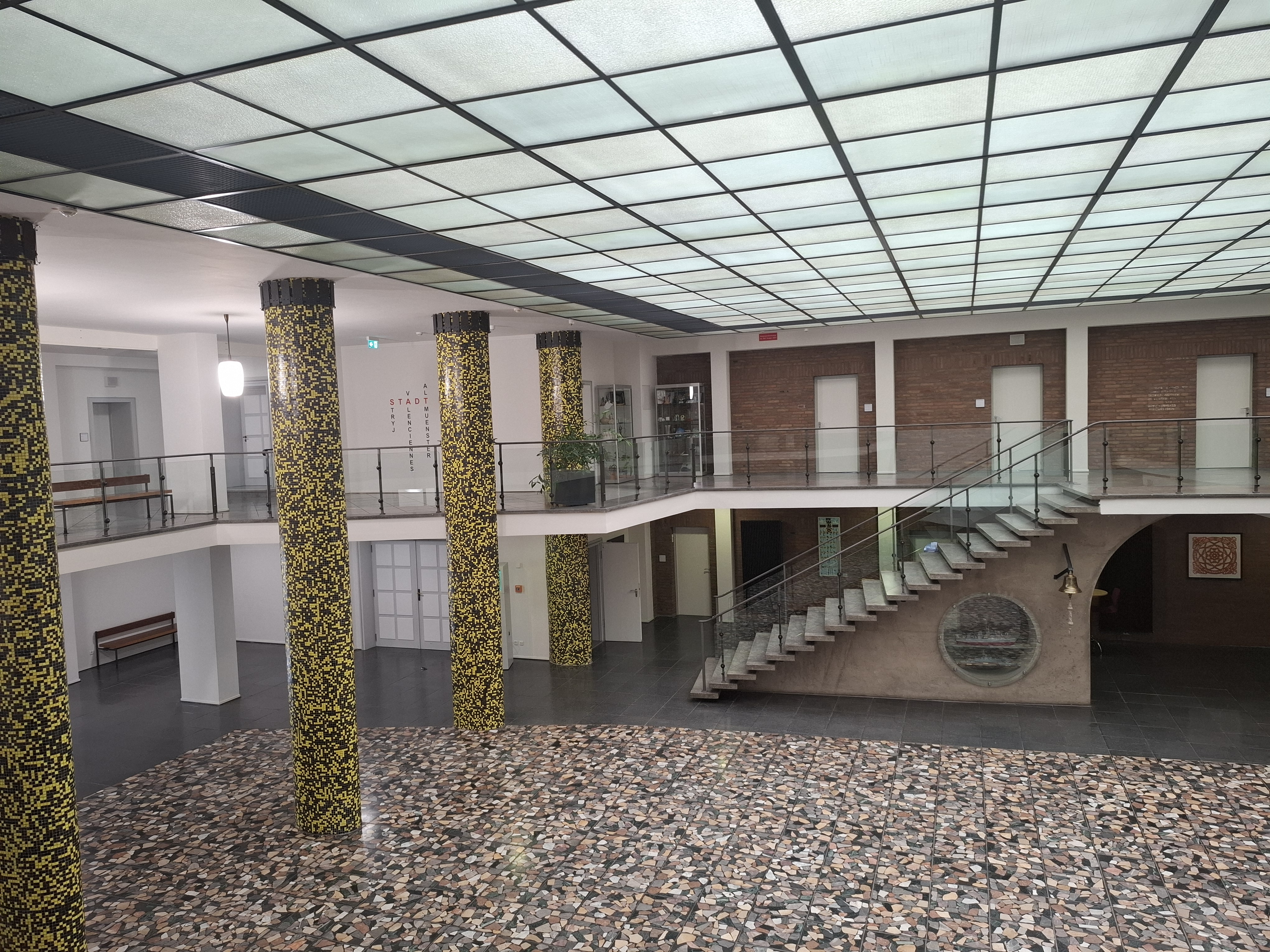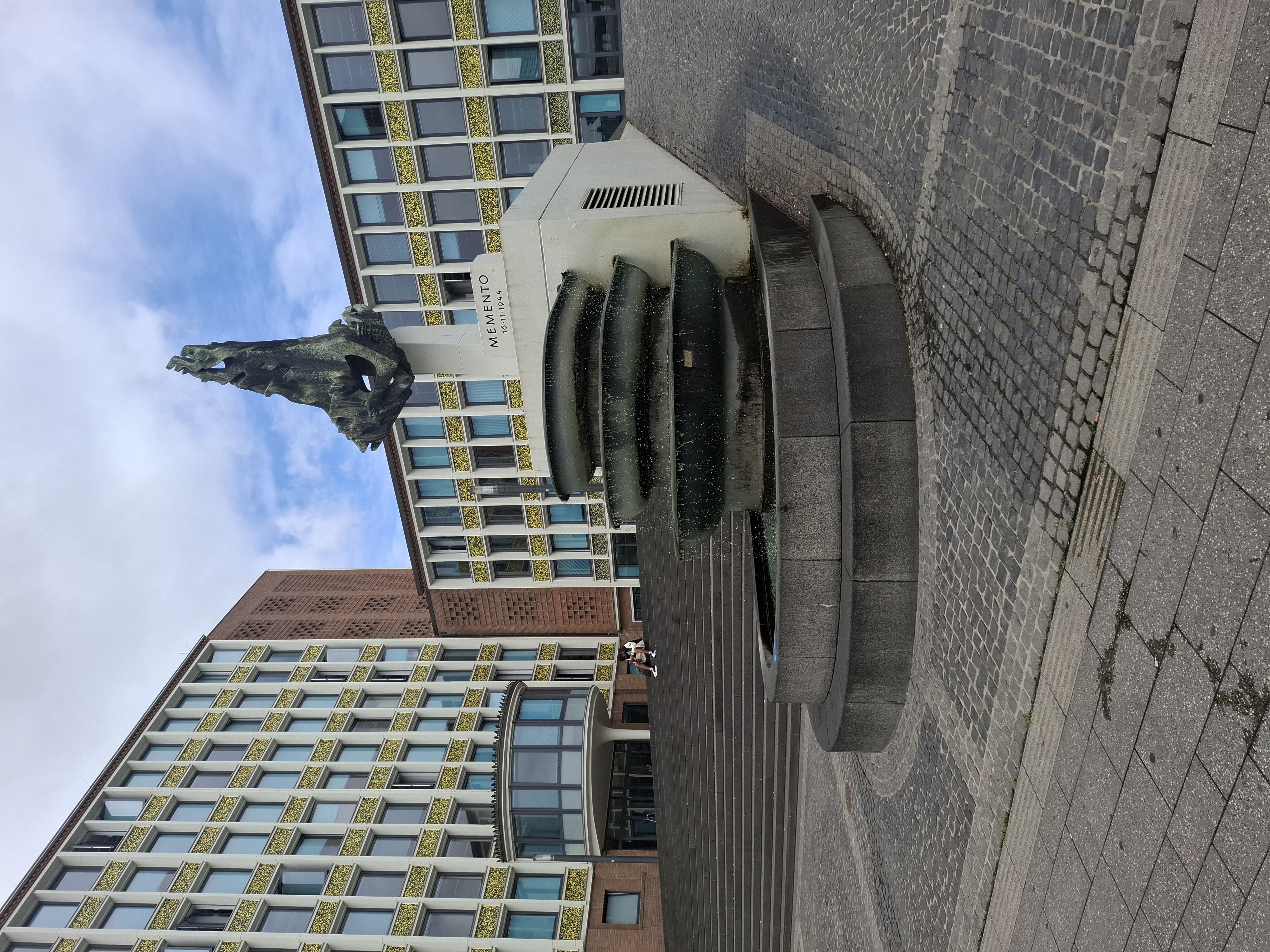 Nach der Zerstörung im 2. Weltkrieg hatte der Wiederaufbau der lebenswichtigen Infrastruktur der Stadt Priorität. Erst 1954 wurde ein Wettbewerb für das neue Rathaus ausgeschrieben, aus dem der Entwurf des Architekten Denis Boniver als erster Preisträger hervorging. Der dreiteilige Gebäudekomplex mit dem markanten Turm nd gelb-schwarzen Mosaiken prägt das Stadtbild.