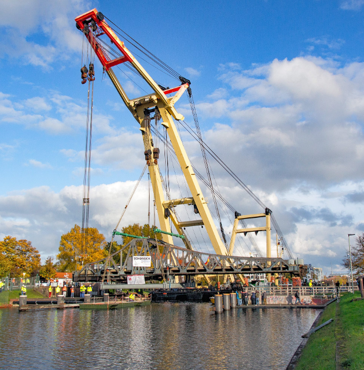 Die ungleicharmige Drehbrücke wurde 1908 anstelle einer 1881 erbauten Holzbrücke errichtet und feierte 2008 ihr 100-jähriges Bestehen. Sie überquert den Ems-Jade-Kanal, der eine wichtige Verbindung des Inneren Hafens zur Ems für Schiffe in Wilhelmshaven ist. Um Schiffen die Durchfahrt zu ermöglichen, öffnet sich die Brücke über 2,10 Meter. Im Oktober 2020 startete eine umfassende Sanierung mit einem aufwendigen Abtransport der Brücke. Als Ersatz wurde eine Behelfsbrücke in der Nähe eingerichtet.