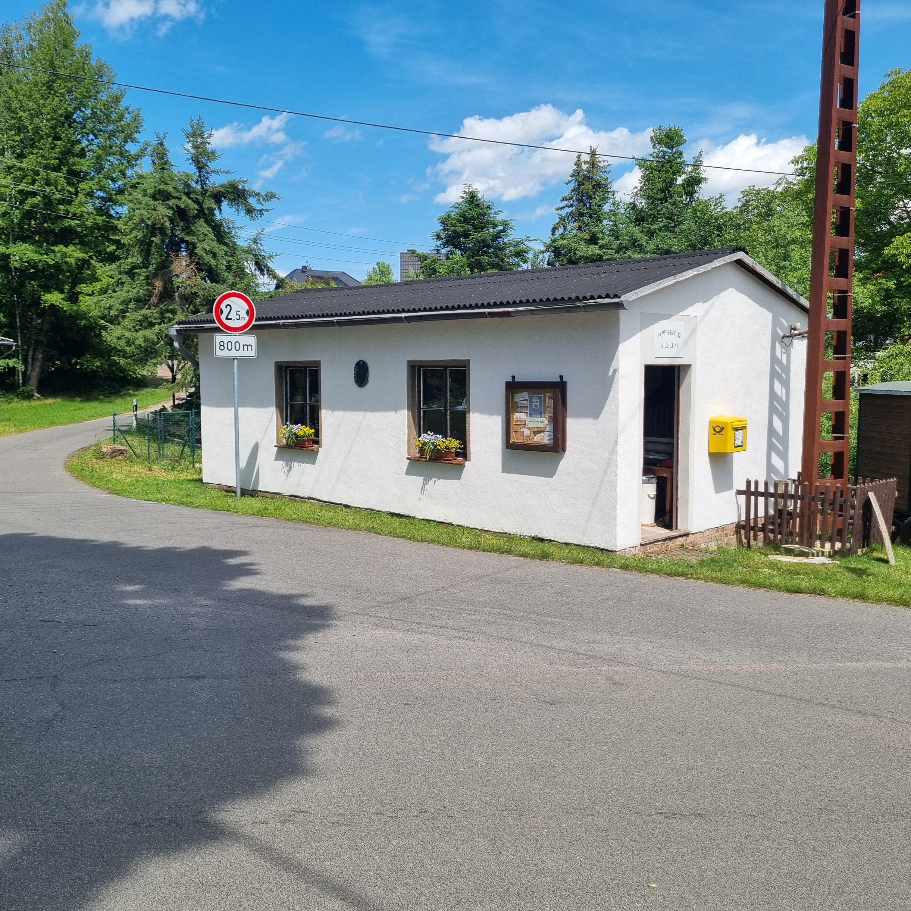 Mangelhäuschen Diedenhain mit historischer Wäschemangel aus den 1950/60er-Jahren.