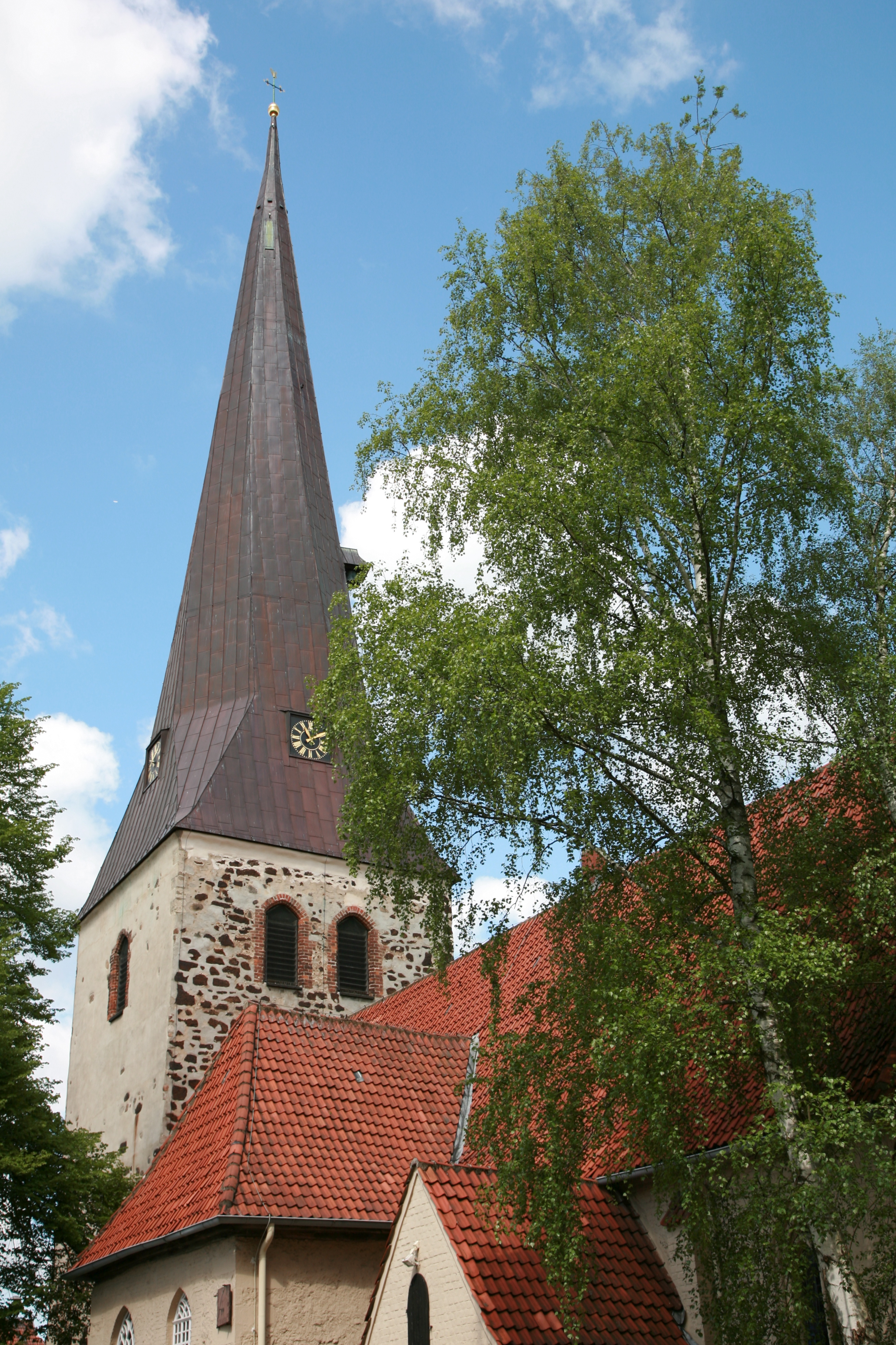 Die spätmittelalterliche Saalkirche besitzt einen quadratischen Wehrturm (15. Jh.) aus Feld- und Raseneisenstein mit Schießscharten und achteckigem Helm. Das Langhaus (3 Joche) zeigt romanische Substanz (um 1200), wurde um 1450 erweitert und 1989 geschlämmt. Kreuzrippengewölbe (ab 1500), Emporen, ein Chor mit dreiseitigem Abschluss und eine bemalte Decke (16. Jh., 1994 freigelegt) prägen das Innere. Eine Orgel von 1996 ersetzt das 1959er Vorgängermodell.