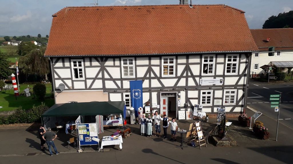 Ab 12:30 Uhr beginnt offiziell der Markt und die Führungen am Hugenotten und Waldenser Archiv Nähen von Trachten Webstuhl