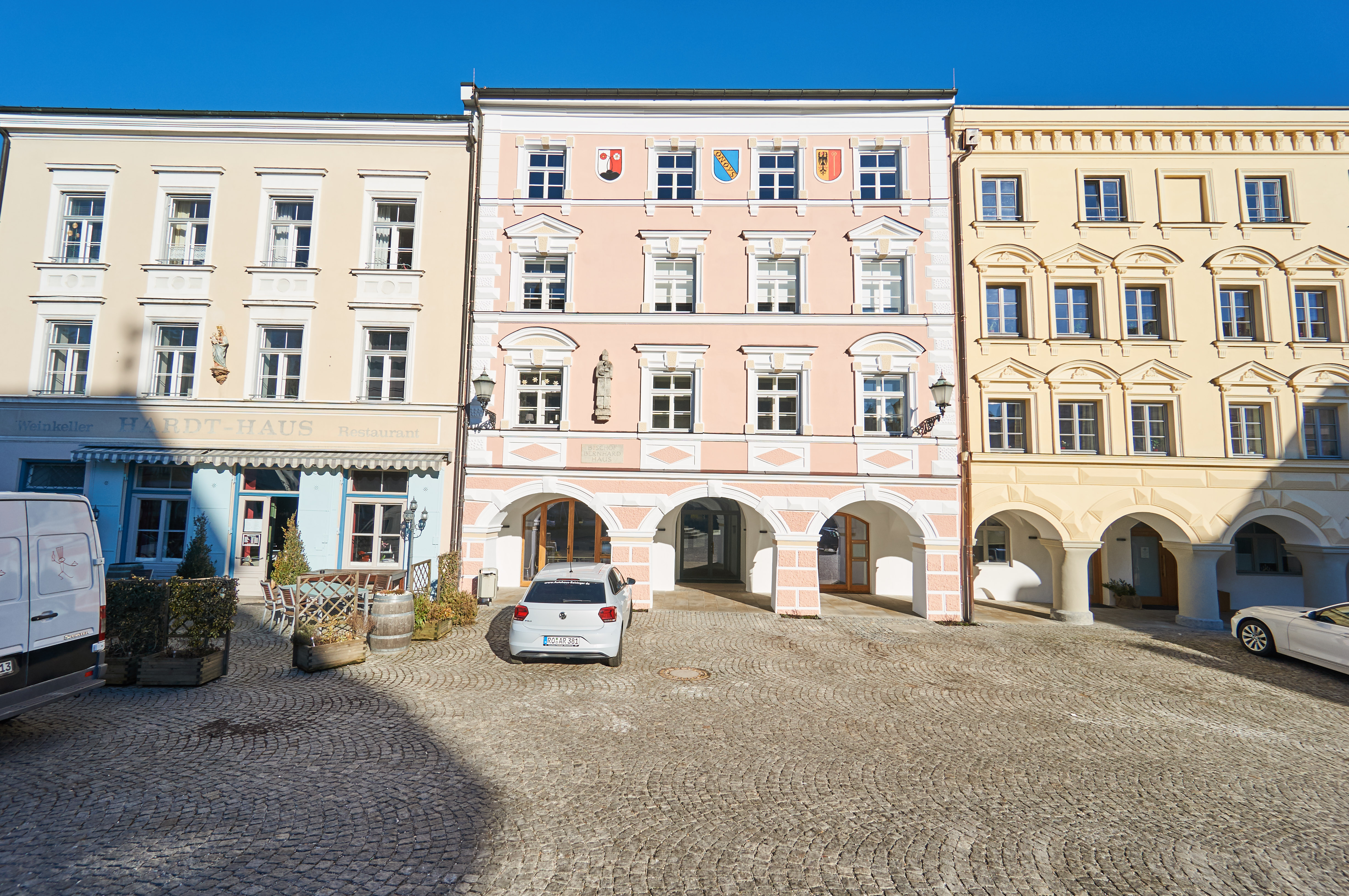 Ehemaliges Handelshaus am Kraiburger Marktplatz, direkt gegenüber der Pfarrkirche mit vorgelagertem Arkadengang und neuklassizistischer Fassade. Das viergeschossige Gebäude reich im Kern bis ins Spätmittelalter zurück und beherbergt heute das Pfarrheim sowie im 2. Obergeschoss das Sakrale Schaudepot des Pfarrverbands Kraiburg.
