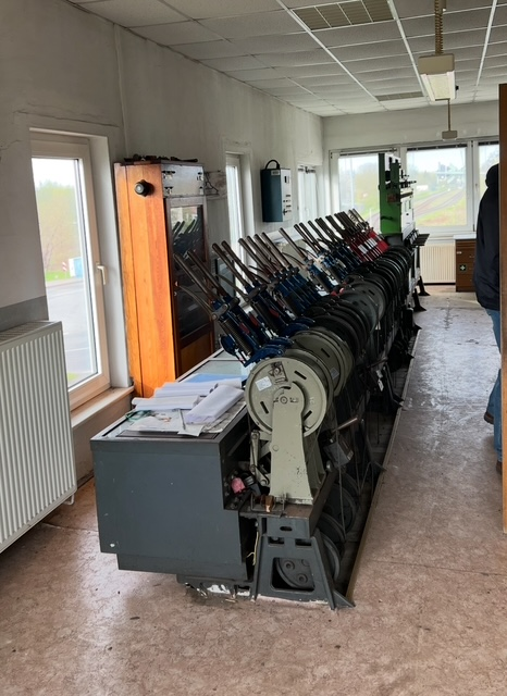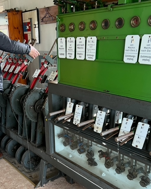 Altes Befehlsstellwerk, komplett ausgestattet mit der alten Technik. Ehemaliger Mitarbeiter der DB erklären die Aufgaben eines "Stellwerkers" (Steile Treppe im Gebäude)
