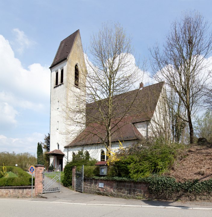 Die evangelische Kirche wurde von 1930 bis 1931 im „Heimatstil“ mit Spitzbogenfenstern, steilem Giebeldach und schlankem Glockenturm errichtet. Der Altar, die Kanzel sowie die Christusfigur über dem Taufstein stammen von dem Freiburger Holzschnitzer Karl Josef Fortwängler. Das Wandfresko „Jesu Begegnung mit der Samariterin am Brunnen“ wurde von Eugen Kühlewein (Karlsruhe) gestaltet.