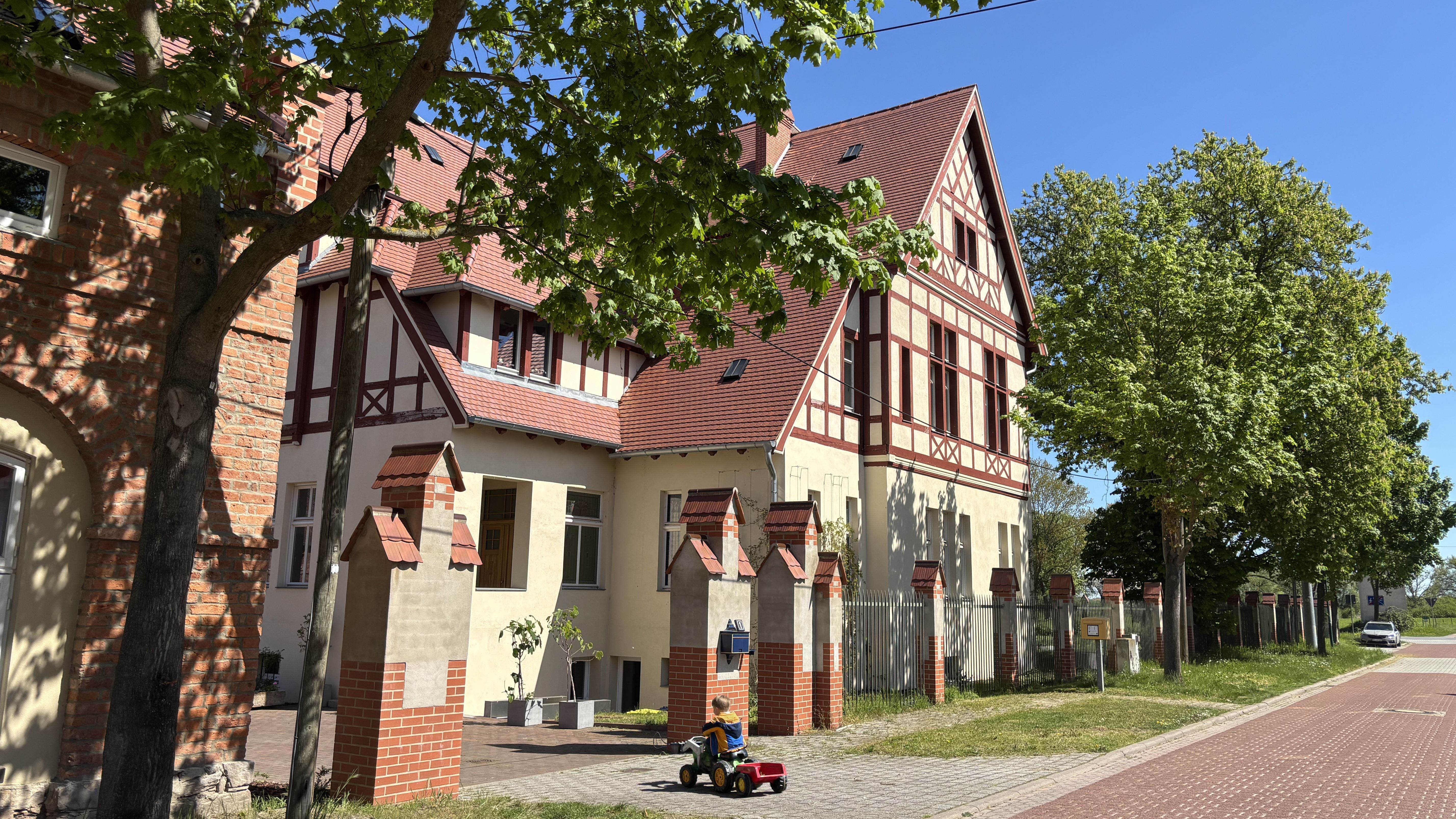 Der Ort Kermen wurde erstmals in Urkunden der Jahre 1298 und 1330 erwähnt. Das östlich gelegene Rittergut war ursprünglich im Besitz des Adelsgeschlechts von Statius und ging im 18. Jahrhundert hochverschuldet an den Fürsten von Anhalt-Zerbst über. Als nun fürstliche Domäne wurden die landwirtschaftlichen Hofbetriebe aufwendig saniert und langfristig verpachtet. Das Haus des Pächters und Oberamtmannes von Kermen wurde 1905 innerhalb des Hofbetriebes neu errichtet. Architekt war Johannes Kraaz.