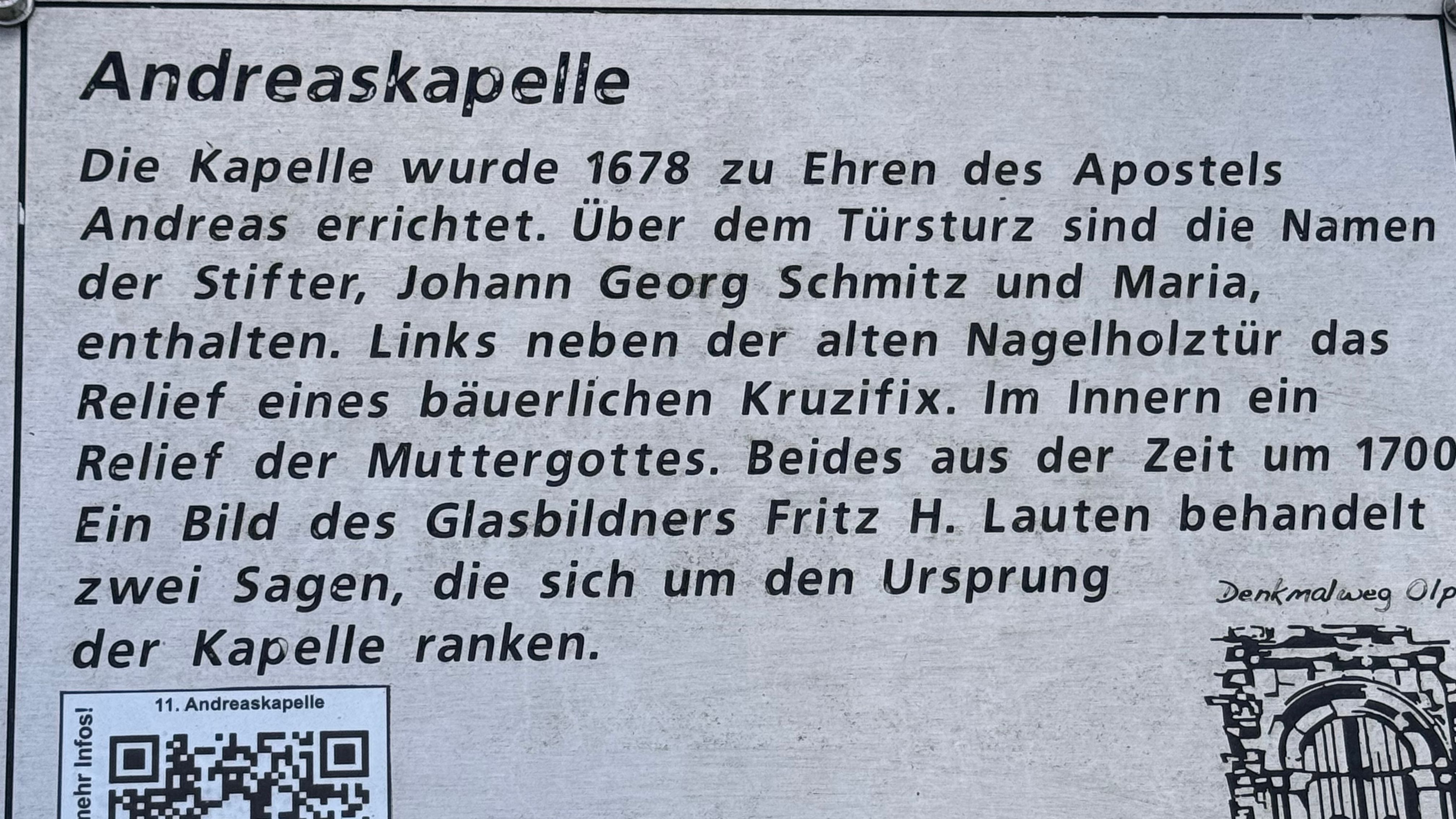Die St. Andreas Kapelle wurde laut der Inschrift über der Tür am 22. Juli 1678 von Johann Georg Schmitz und seiner Frau Maria errichtet. Sie wurde 2012 umfassend renoviert. Das kleine Fachwerkgebäude misst ca. 2,5 × 2,5 m und hat einen einfachen Altar, ein Sandstein-Relief mit Maria und Kind sowie ein Buntglasfenster des lokalen Künstlers Hans Lauten mit zwei illustrierten Sagen (Schlange in der Milch; Teufel am „Teufelswieschen“). Früher war sie das Ziel der Fronleichnamsprozession aus Olpe.