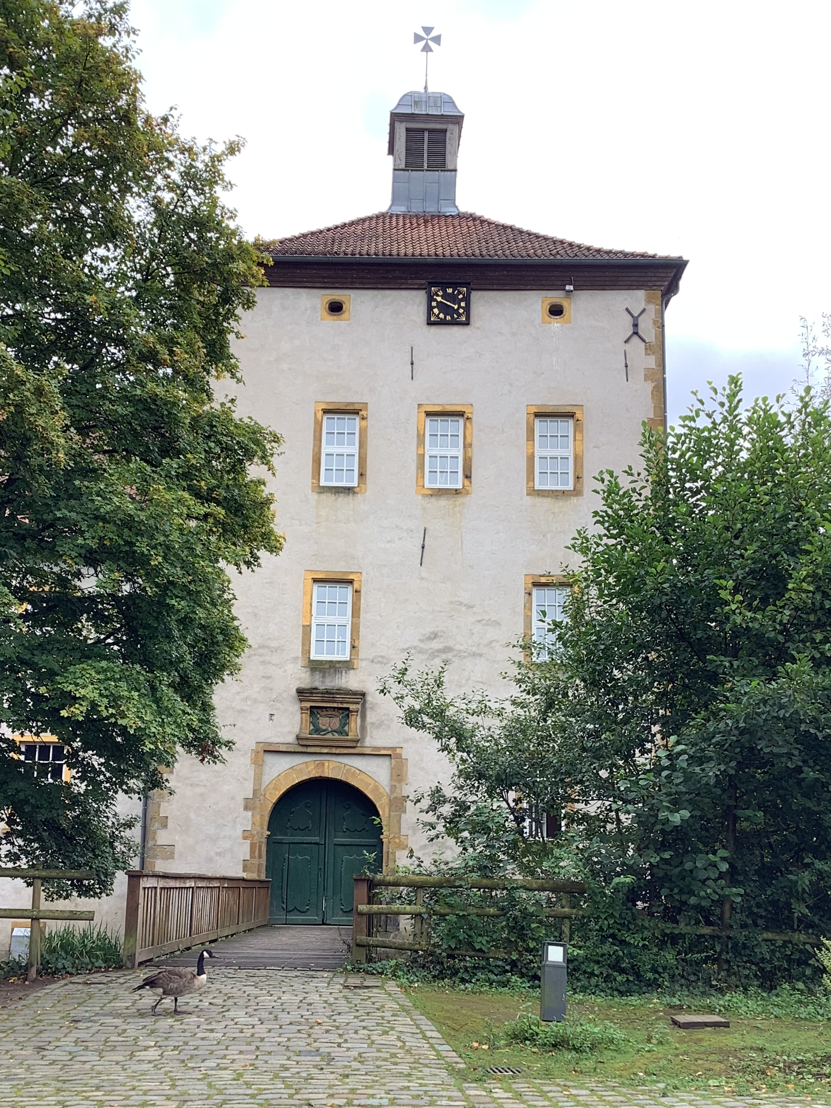 Wasserburg um 1415 mit Wohnturm, Nebengebäuden und Kerker. Historische Wandmalereien von 1799 und großer Garten. Heute Biologiezentrum Gut Bustedt.