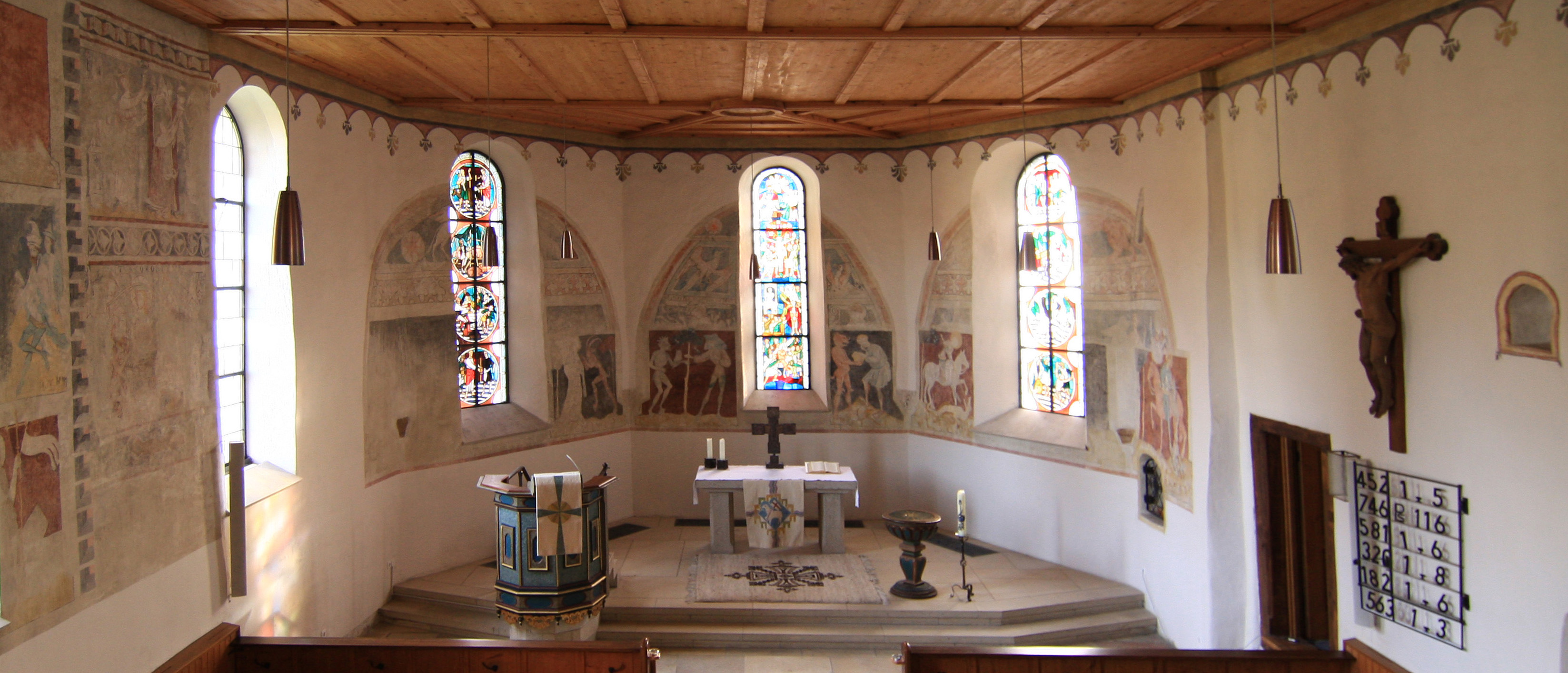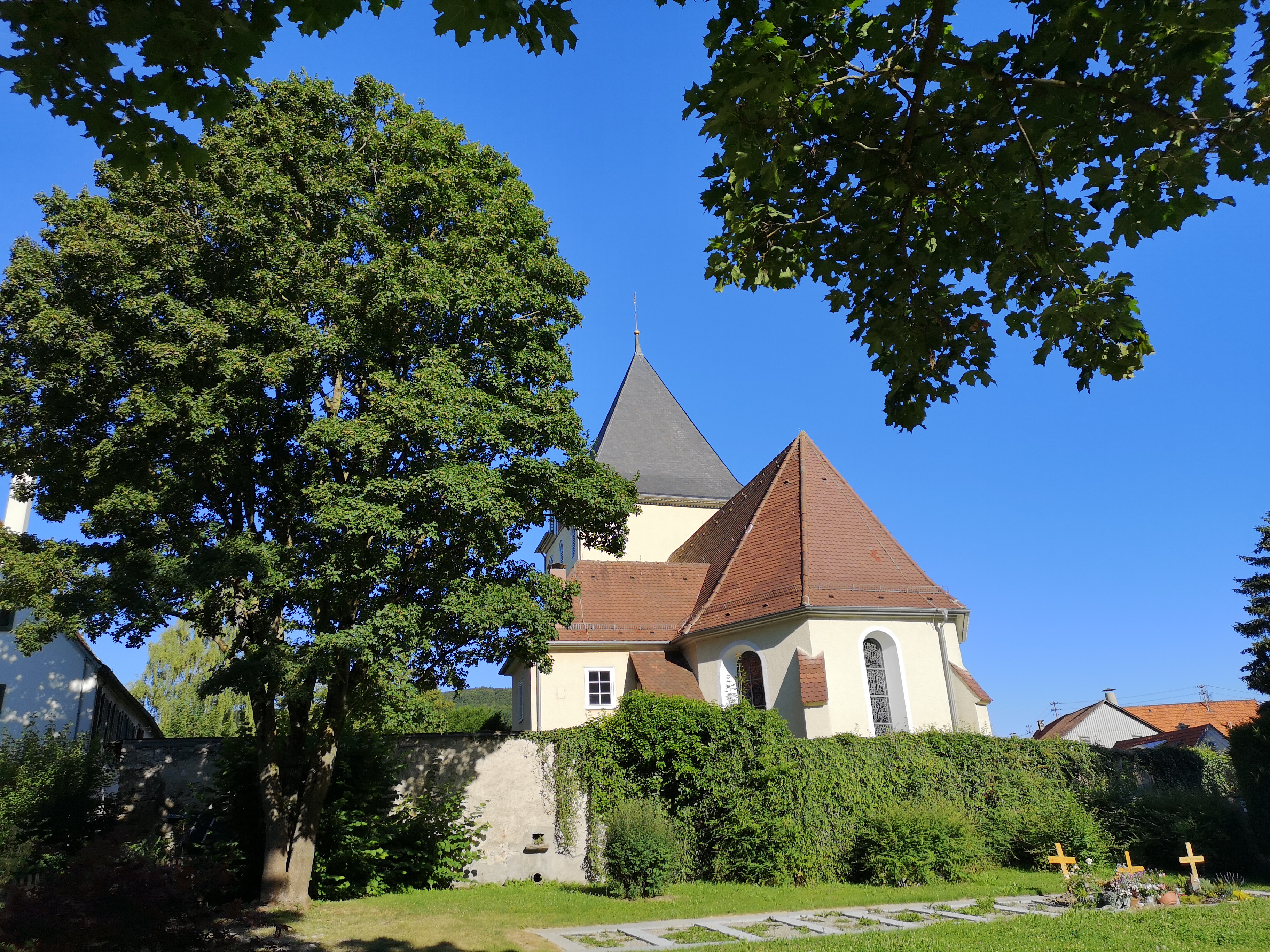 Kirchengebäude mit 1400-jähriger Geschichte, alemannische Gräberfunde, Freskenbestand aus dem 12. und 13. Jh., bestehender Bau aus dem 15. Jh., Nord- und Südwand aus dem 12. Jh. Kirchenfenster aus der Glaskunstwerkstatt Adolf Saile aus den 1970er- und 1990er-Jahren. Altarkreuz und Leuchter des Hohenstaufener Künstlers Hermann Schwan von 1990.