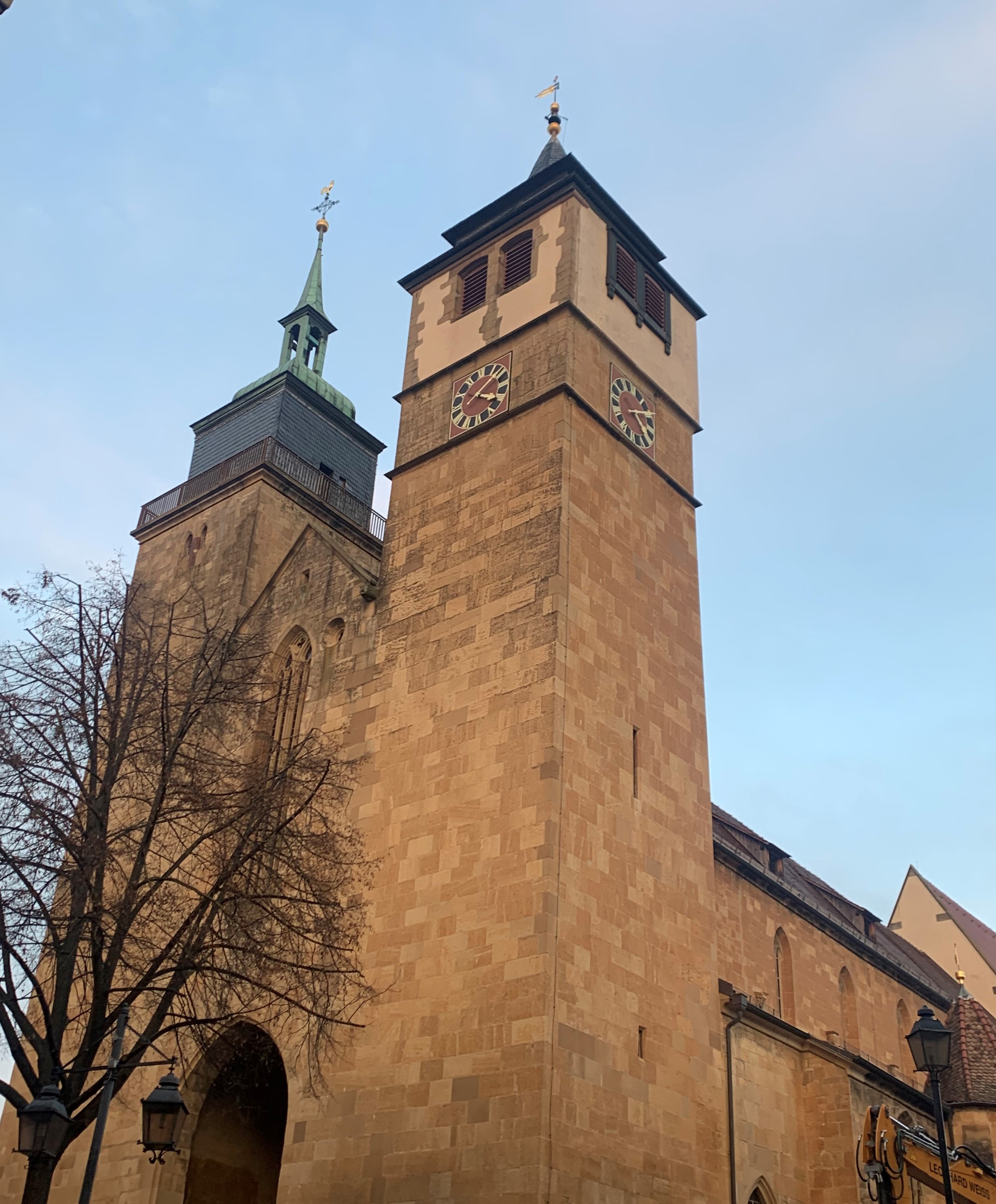 Die Bartholomäuskirche wurde zwischen 1250 und 1472 auf der Basis eines romanischen Vorgängerbaus errichtet. Sie besteht aus Lettenkeuper-Sandsteinquadern und besitzt ein markantes Turmpaar aus Hochwacht- und Glockenturm sowie einen großen spätgotischen Chor. Erste Erwähnungen datieren auf 1150, archäologische Funde deuten auf eine romanische Basilika des 11./12. Jhs. hin. Bedeutend sind das reich verzierte Chorgestühl um 1300, ein Taufstein von 1426/1492 und gotische Wandmalereien.