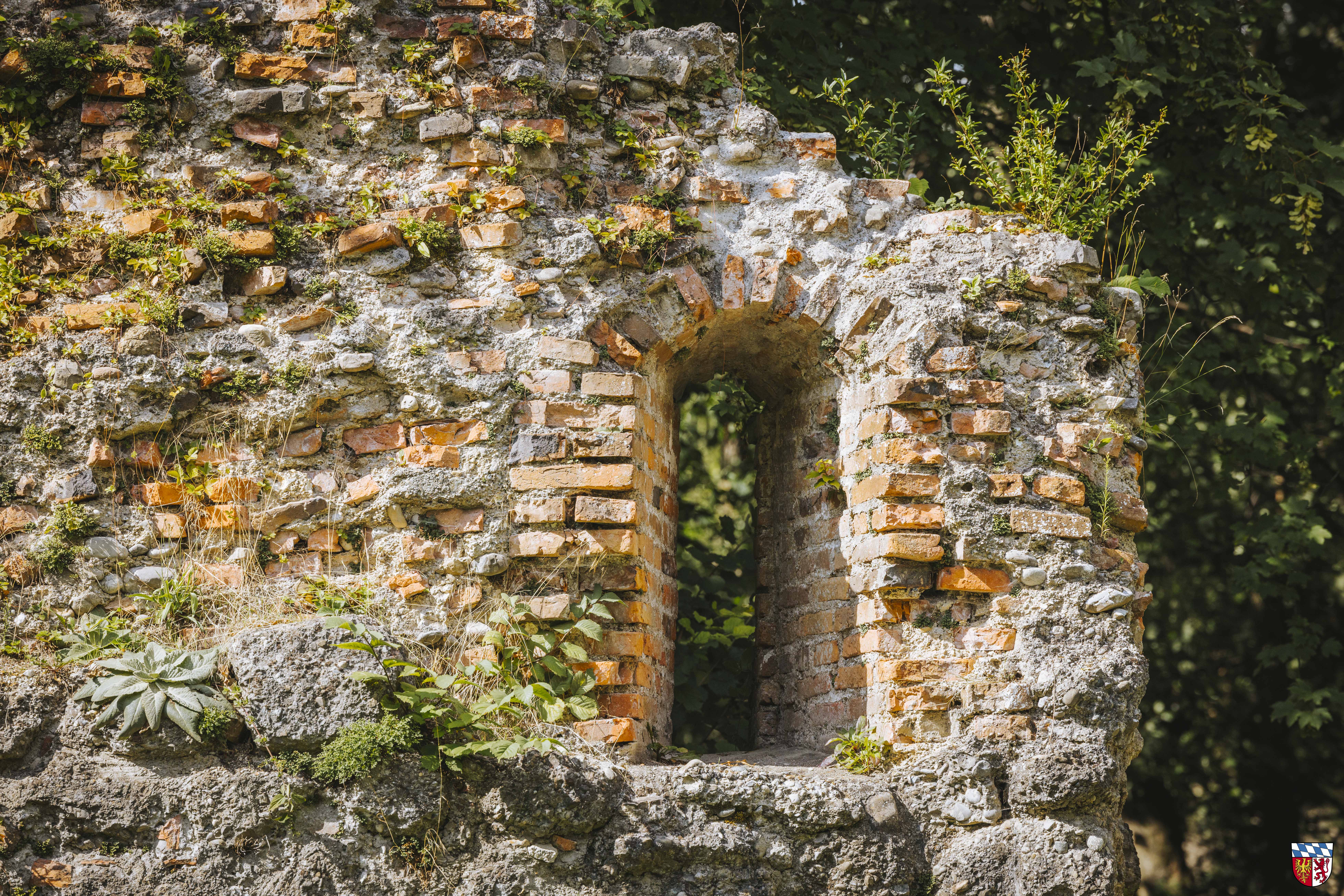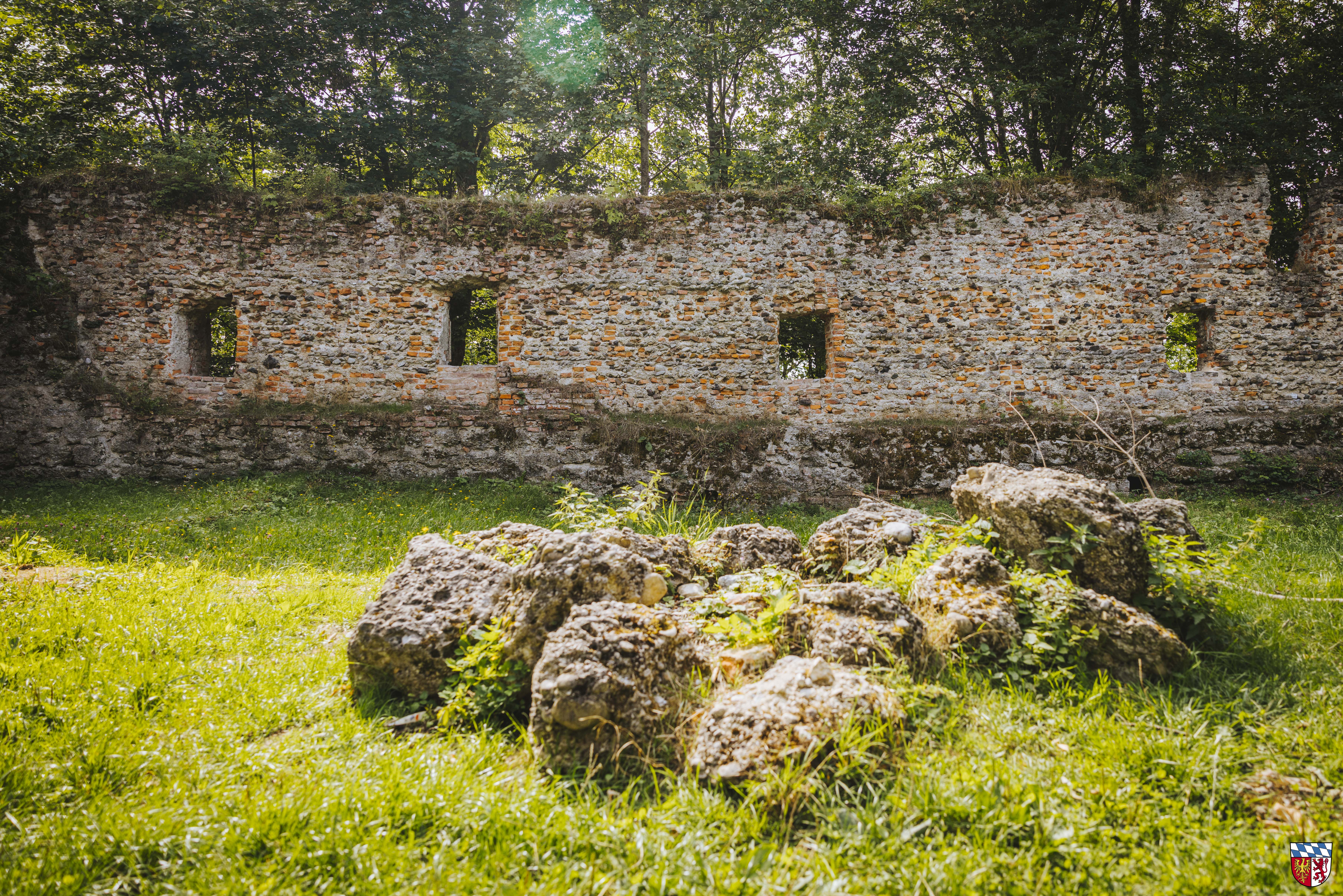 Romanische Burgruine und Bergfried aus Nagelfluhquadern. Mauerzüge, Ummauerung eines Innenhofs und Ruine der ehemaligen Burgkapelle St. Erasmus 1. Hälfte des 15. Jhs.